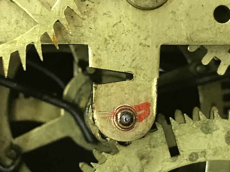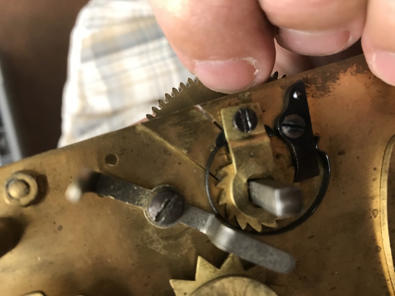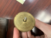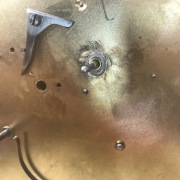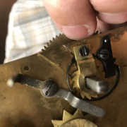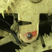 To the right you can see a springbarrel missing a tooth. While in repair the spring raptured, taking out the tooth. Instead of repairing it, the repairman simply changed the position of the springbarrel to the hour strike train to make it least notible. He only informed his customer of the raptured spring and of course, charged him for a completed restoration.